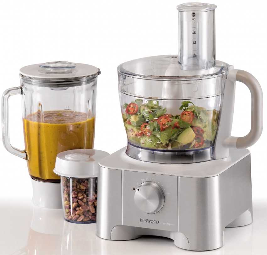 В комплекте блендер (1 л – объем) и мясорубка, венчики и насадки для теста, полупрозрачная крышка с отверстием для загрузки. Также присутствуют стальной диск-терка для сырых овощей. Богатая комплектация делает прибор многофункциональным для приготовления пищи. В нем можно замешивать до 2 кг теста, измельчать мясное филе и овощи.