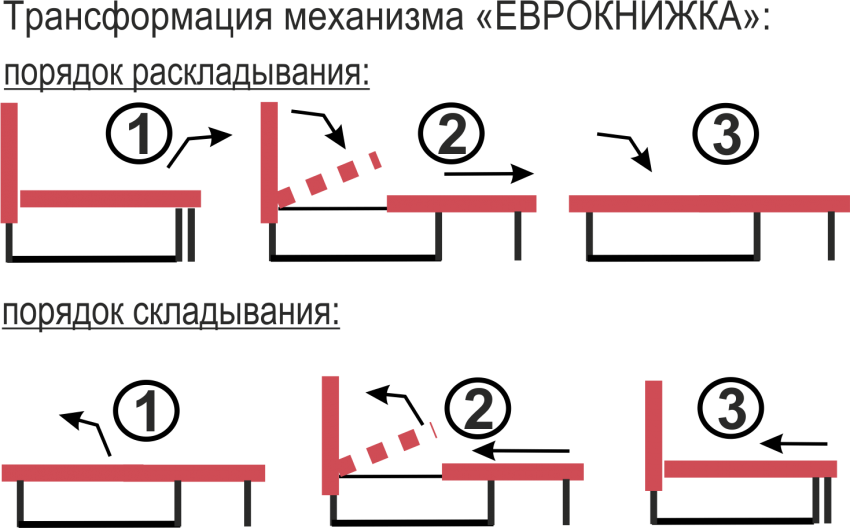 Схема трансформации дивана книжки, достоинства и недостатки: