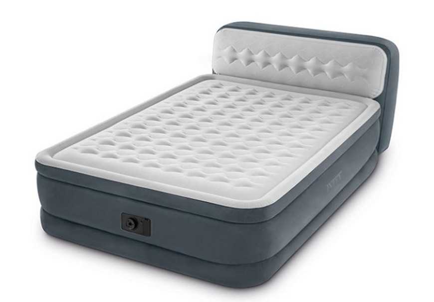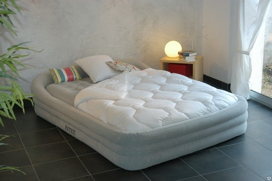 - Модель с подголовником – лучшая надувная кровать для сна. Подобные ложа имеют незначительный вес, легко сдуваются, пригодны для транспортировки. Хорошо умещаются в шкафу или на антресоли в сдутом виде. Надувные кровати со спинкой бывают со встроенным или отдельным насосом. Имеются односпальные, двуспальные и детские вариации.