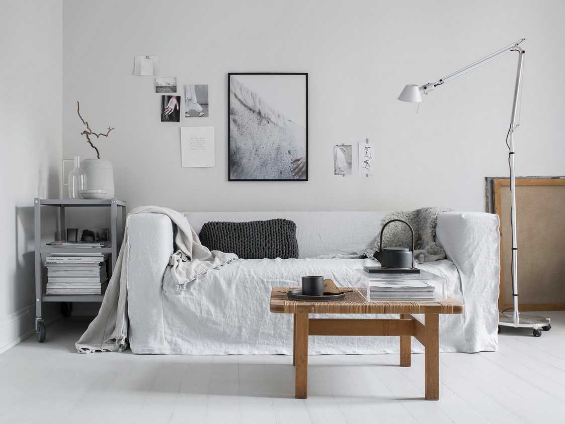 На фото покрывала серого и черно-белого цвета в оформлении дивана в гостиной в скандинавском стиле.