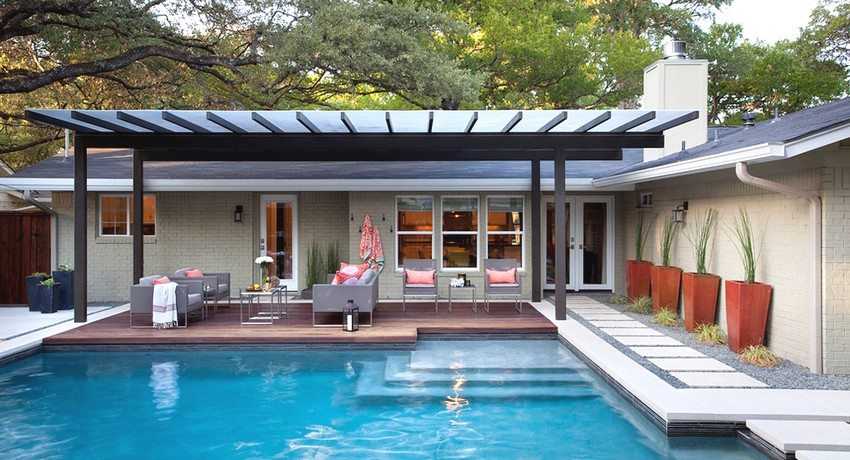 Стационарный навес их поликарбоната над бассейном и зоной отдыха