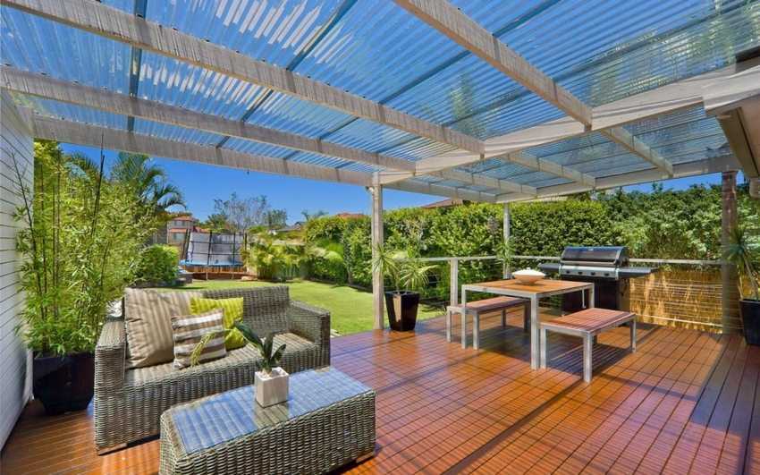 Навес с покрытием из поликарбоната идеально вписывается в дизайн придомовой территории