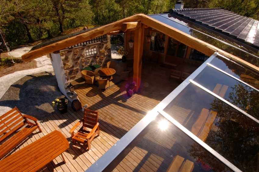 Самый простой вариант — односкатный навес из поликарбоната, оптимальный угол наклона крыши 22-30о. Стропила изготавливаются из дерева либо это ферма – горизонтальная, выгнутая или треугольная рама с поддерживающими раскосами, стойками под углом внутри основной конструкции.