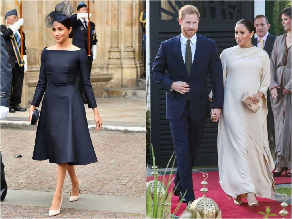 Став герцогиней, Meghan Markle также пришлось пересмотреть свой гардероб, отдав предпочтение элегантным нарядам британских и французских люксовых брендов. Темно-синее платье с расклешенной юбкой Меган выбрала для службы в Вестминстерском аббатстве, украсив наряд любимыми лодочками и небольшой шляпкой. Для официальной поездки в Марокко в честь ужина у британского посла, Меган Маркл также выбирает изящное платье Christian Dior. Образ получился полностью закрытым, но очень женственным.