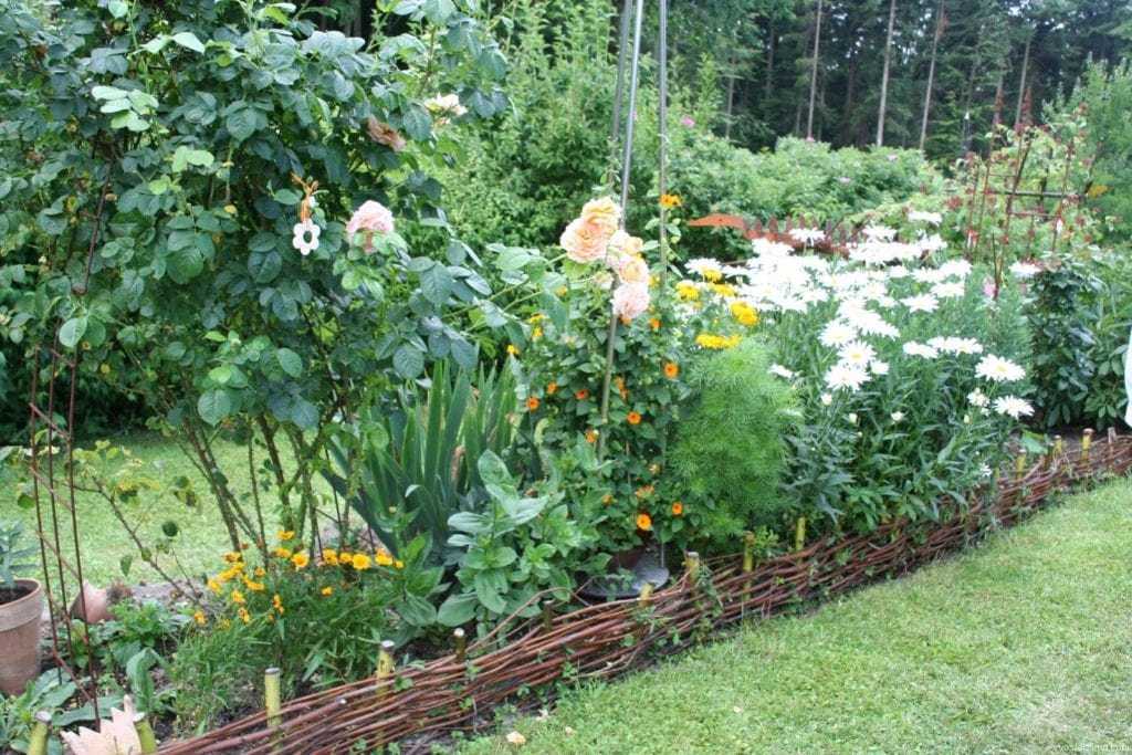 Владельцы дачных участков придумали множество способов ограждения цветников из подручных материалов. Их применение зависит от назначения клумбы, характера грунта, высоты растений. Для ограничения распространения корней применяют заглубленные модели, которые вкапывают в землю. Материал такой ограды не должен гнить или окисляться. Высокий забор подчёркивает стройность роз, пышность пионов, раскидистых георгинов. Материалы для оградки:
