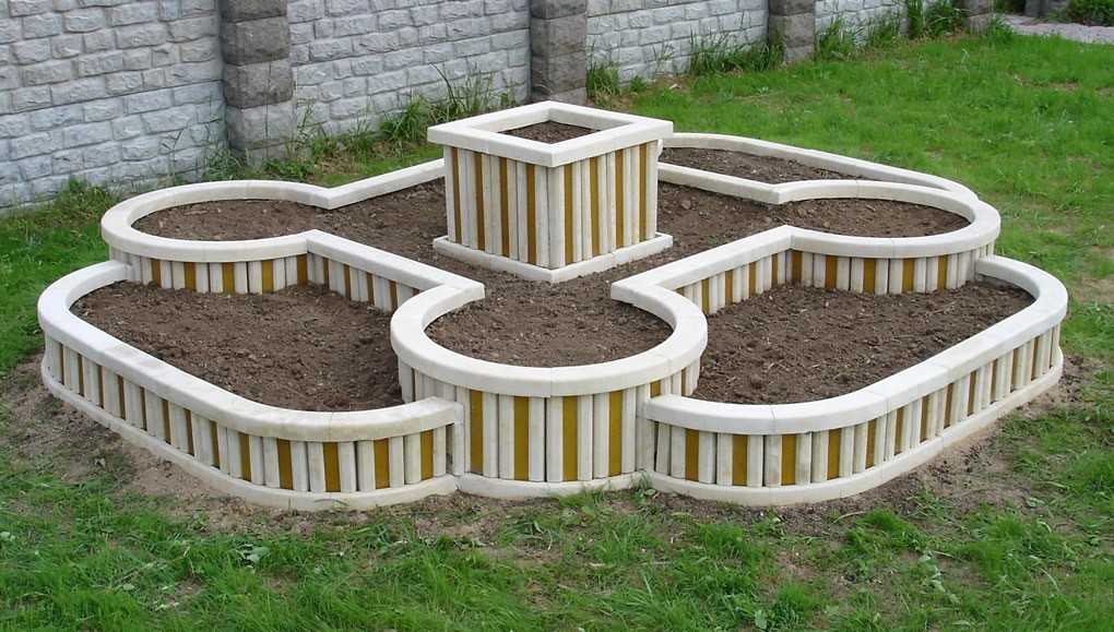 Смесь на основе цементного раствора с щебнем – наиболее удобный материал для изготовления небольшого заборчика вокруг палисадника. Жидкому бетону придают любую форму, ограждение может повторить заданный контур. Также застывший раствор не гниёт, хорошо переносит жару и морозы. Бетонные бордюры будут долго сохранять чёткие формы.