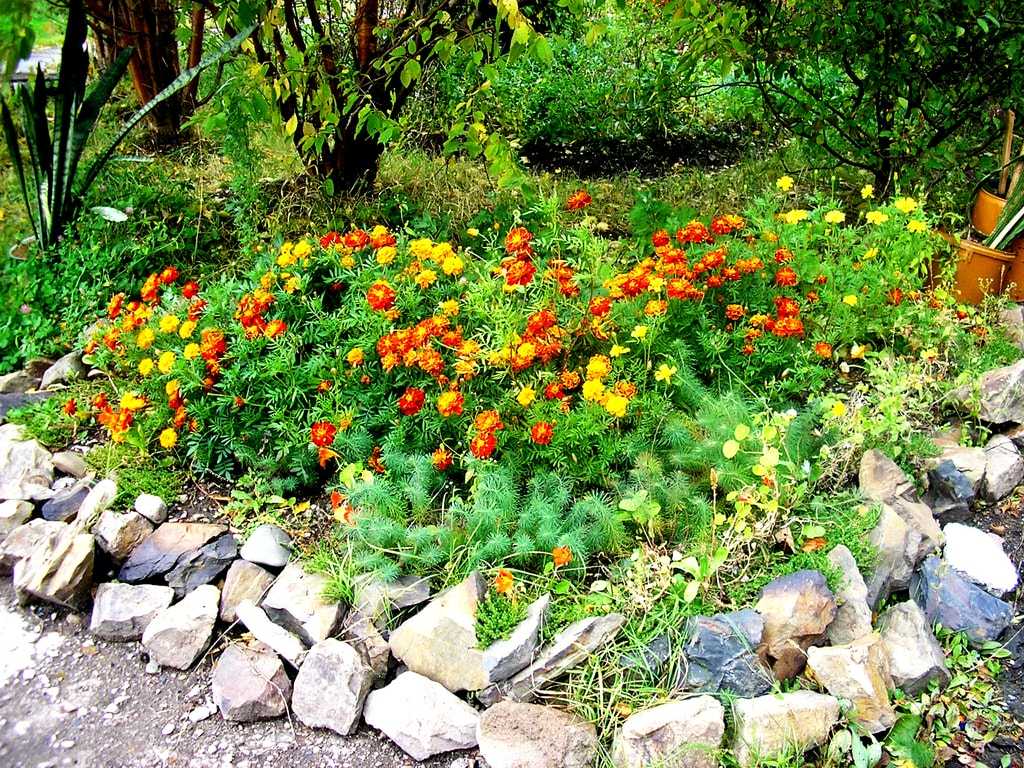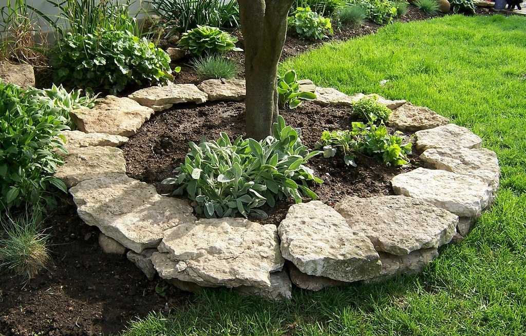 Часто цветники располагают на газонах. Эффективным методом отделения газона от цветника, является сочетание натуральных и искусственных материалов. Как же изысканно смотрится каменный бордюр. Его можно выложить своими руками, тщательно укладывая камни вокруг клумбы.