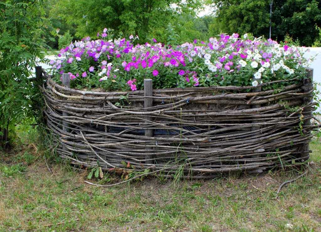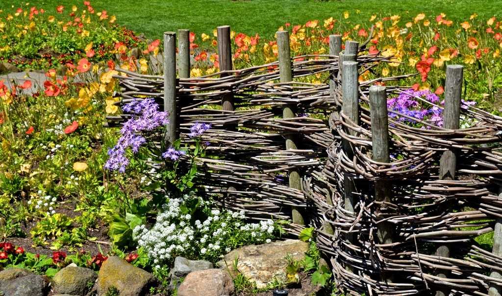 Реально создание прочного ограждения, если применить особые материалы. Можно сделать забор, не уступающий по высоте и прочности кирпичному, сплести невысокое ограждение для клумбы своими руками, чтобы дети и домашние животные не ломали хрупкие стебли высаженных растений. Плести изгородь можно в ширину или в высоту (горизонтальное и вертикальное плетение).