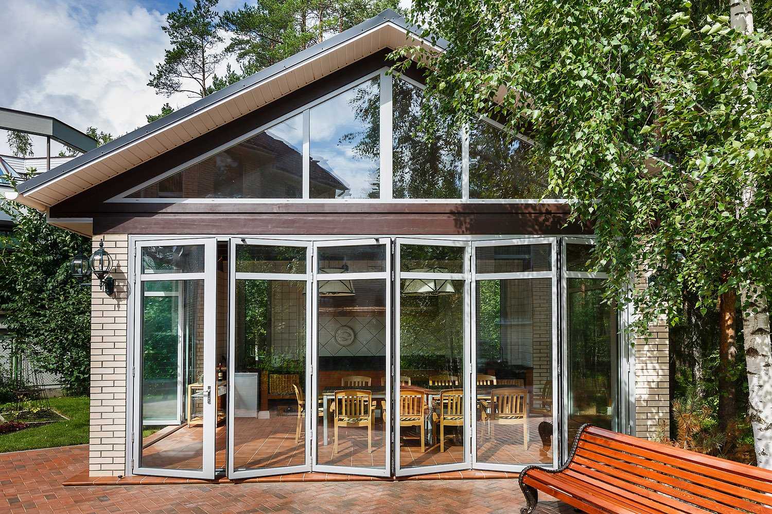 Раздвижное остекление веранды и террасы позволяет установить большие окна различной формы.