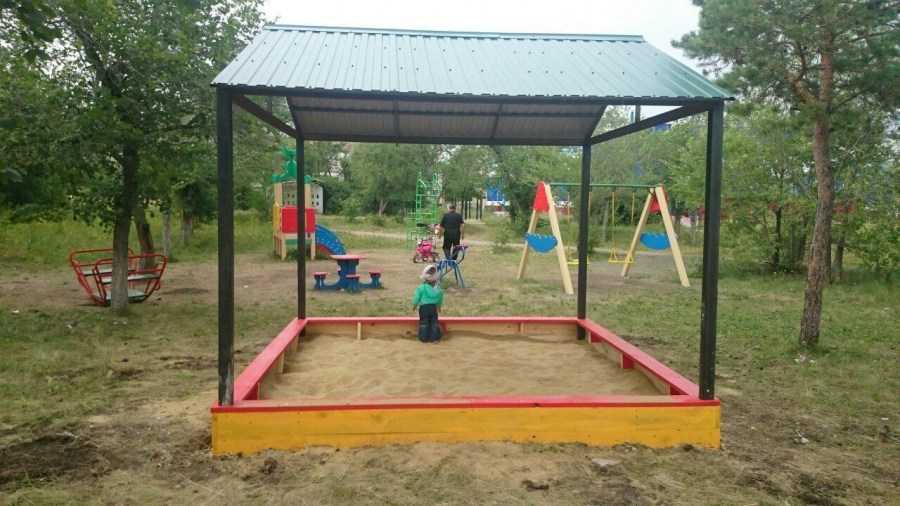 - Песочницу без крыши лучше устанавливать в тени высокорослых растений. Их крона защитит детей от прямых солнечных лучей.