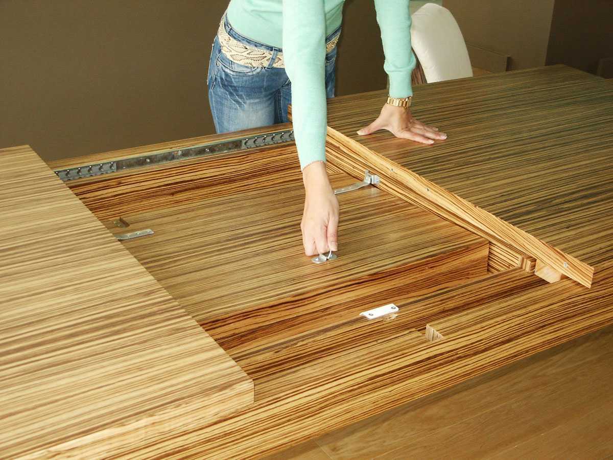 - с выдвижной панелью. Из стола выдвигается дополнительная поверхность на колесиках, помещающаяся на всей площади изделия;