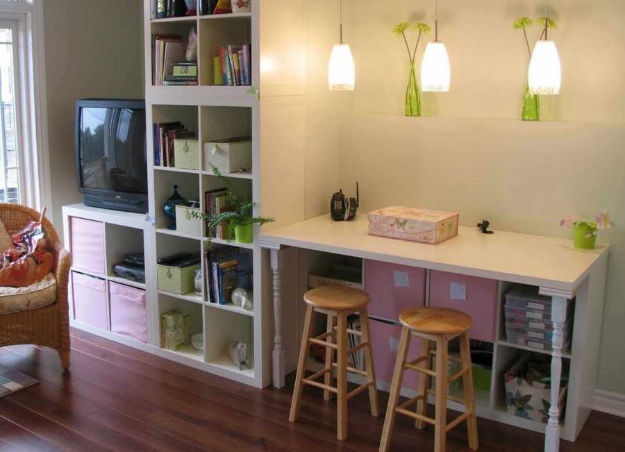 Если Вы имеете ограничения в квадратных метрах, данный вариант именно для Вас. Здесь отдельные части могут быть трансформируемыми, или вовсе, скрытыми, когда они не понадобятся. Небольшой стол, благодаря нескольким движениям превратится в абсолютно полноценную рабочую поверхность.
