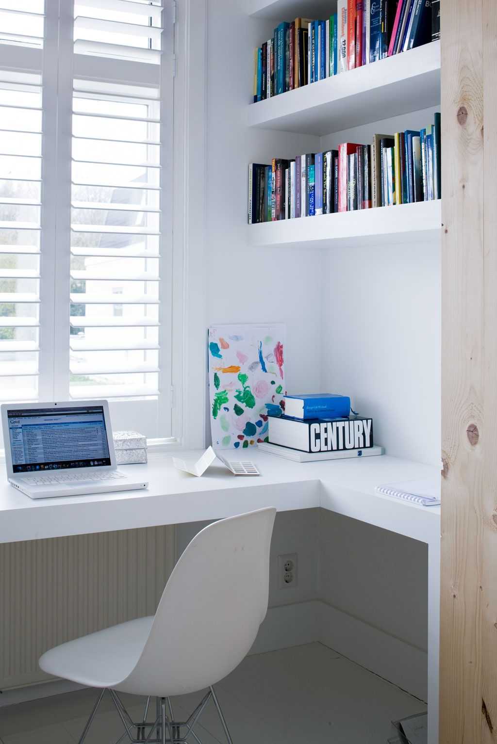 Широкий белый стол, размещенный у окна, обеспечит отличное освещение при работе