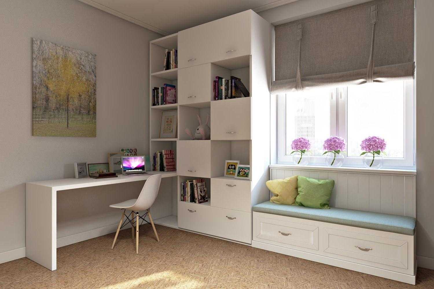 Встроенный стол – это актуальное решение для небольшого по габаритам помещения. Чтобы его сделать, достаточно увеличить площадь подоконника. Форма и размеры могут быть любыми. Неоспоримое достоинство – прекрасное освещение рабочего места солнечными лучами. Зимой ноги ребенка будет согревать батарея, которая находится под окном.