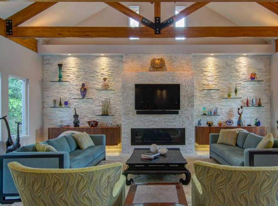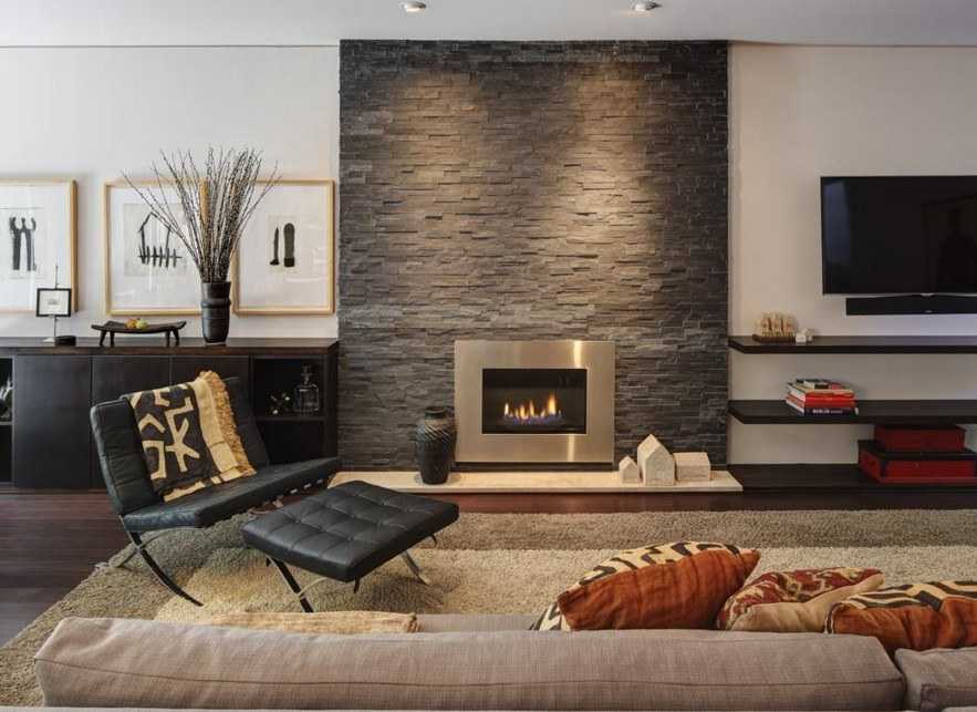 На фото интерьер гостиной в современном стиле с книжными полками геометрической формы, расположенными над камином.