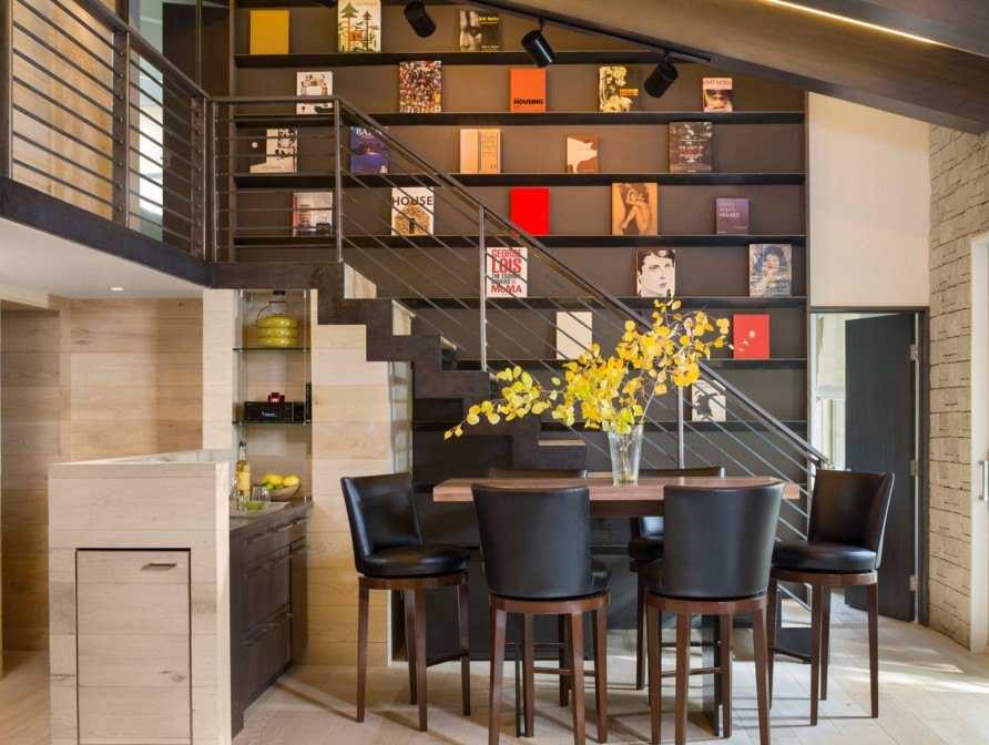 Стилистика лофта предполагает книжные полки с небрежным оформлением, размещенные, например, в асимметричном или шахматном порядке. Сюда прекрасно вписываются более массивные стеллажи, изготовленные из материалов темного оттенка.
