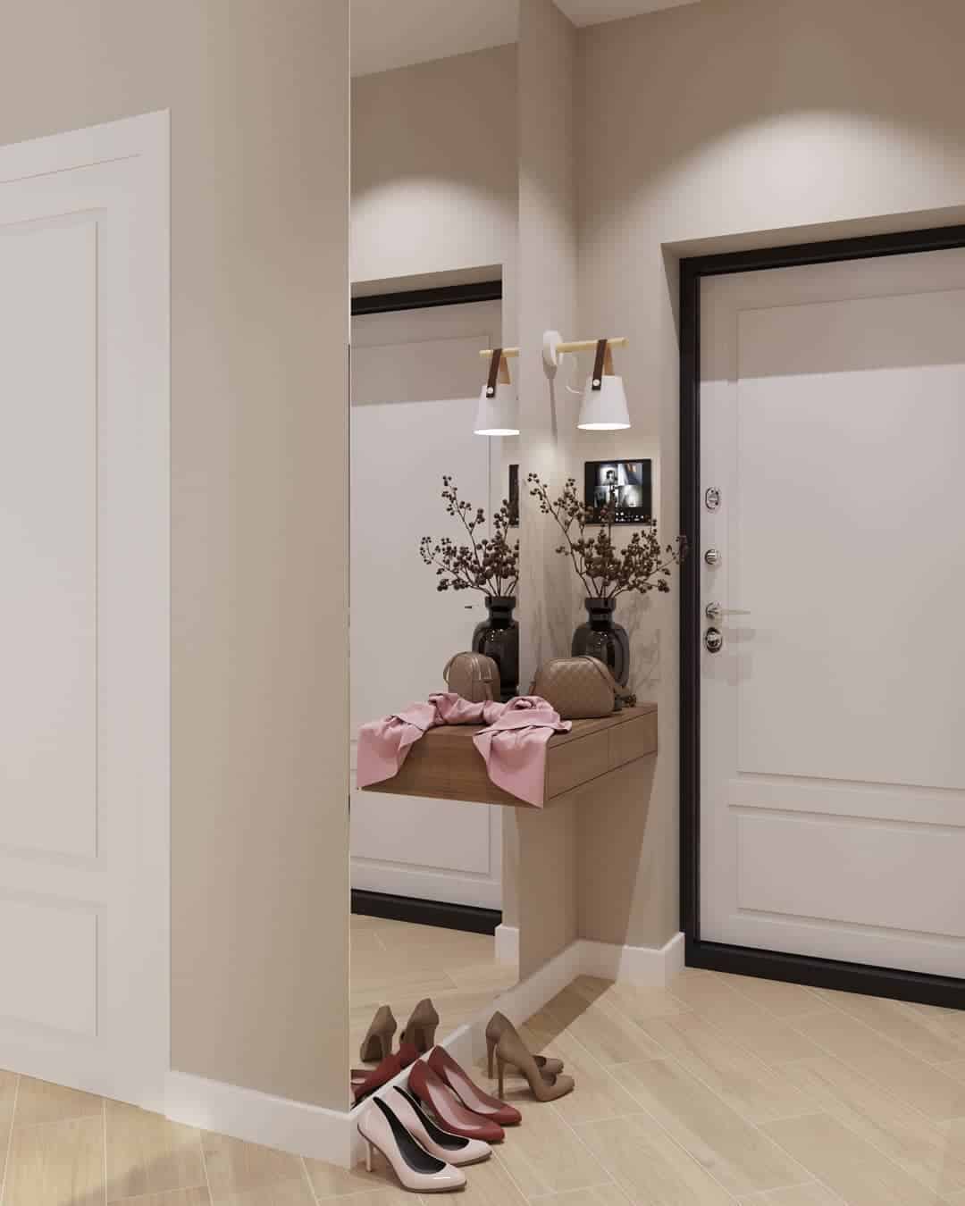 Не рекомендуется располагать прихожую слишком близко к входной двери, это может помешать комфортной эксплуатации конструкции, а также зрительно еще больше сузить пространство.