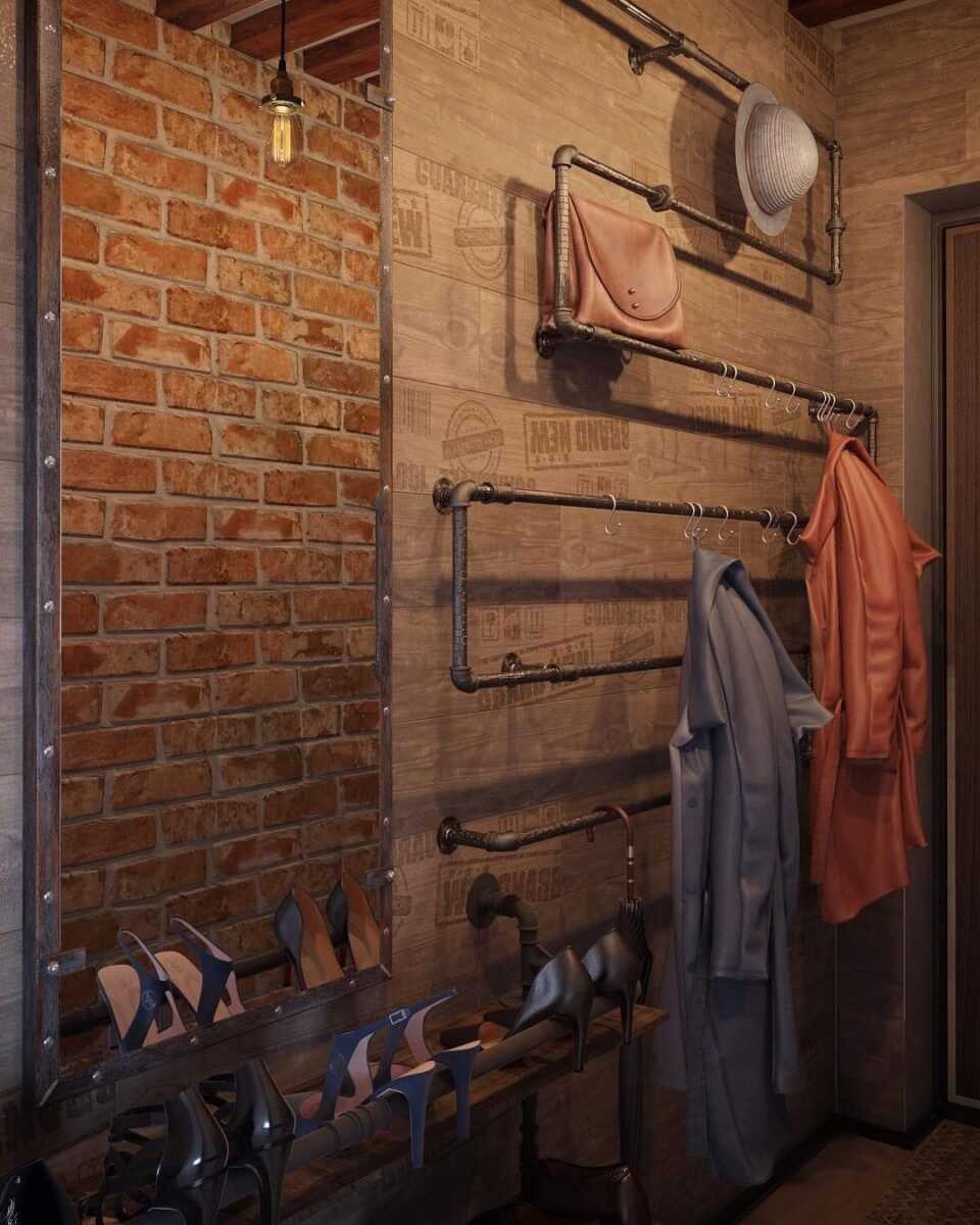 Интересно смотрится интерьер прихожей в стиле лофт, в этом случае вешалка выполнена из водопроводной трубы.