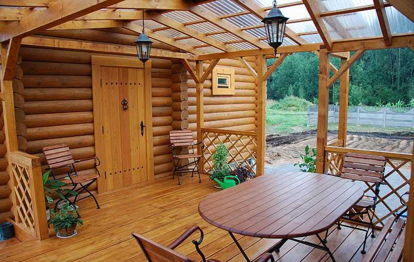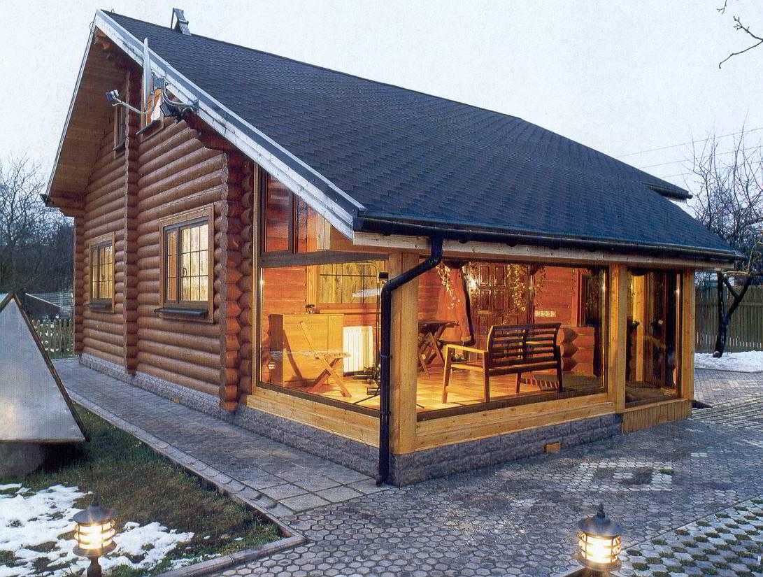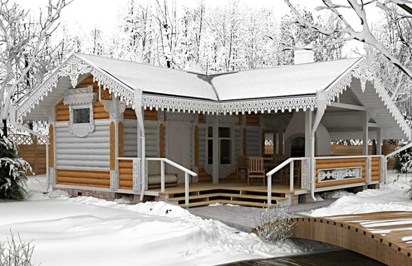 Удачной конструкцией будут проекты бань с комнатой отдыха и террасой. Здесь можно отдохнуть внутри в холодное время года или насладиться природой на террасе летом. Предлагаем мини обзор проектов бани с террасой.