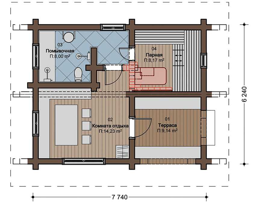 Постройка, которая по-настоящему сможет подчеркнуть статус владельца. «Изюминкой» этой постройки является просторная терраса, дополненная бассейном. После принятия банных процедур вы сможете с большим удовольствием охладиться в холодной воде.