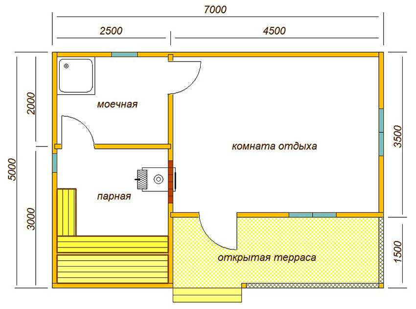 Удобным вариантом будет баня, в которой будет выход из предбанника или комнаты отдыха на террасу, а печка может располагаться в комнате отдыха и служить камином