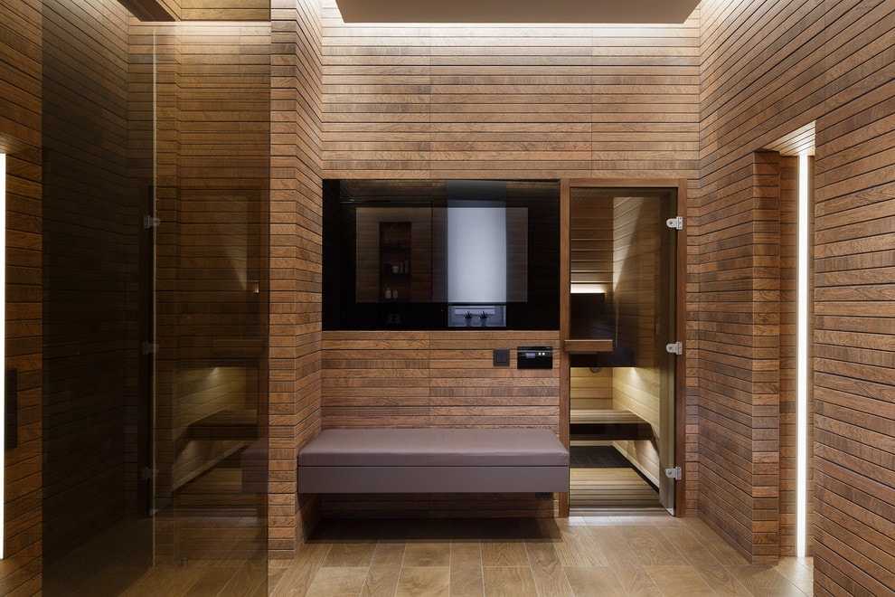Актуальными будут стеклянная душевая кабина, деревянные лавочки и огромное количество махровых полотенец.