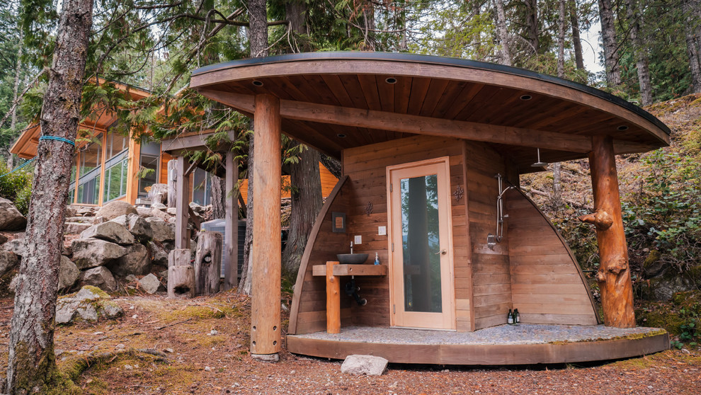 Стильная баня с террасой и крышей