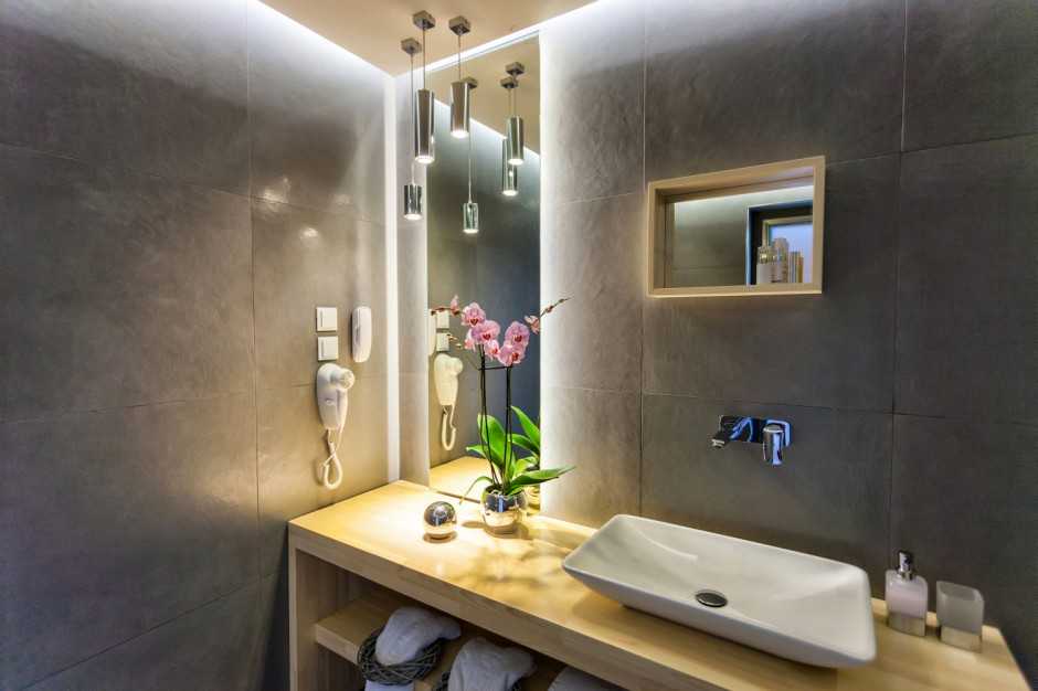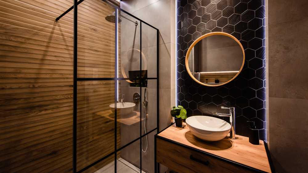 Деревянная столешница в ванной комнате смотрится модно и стильно