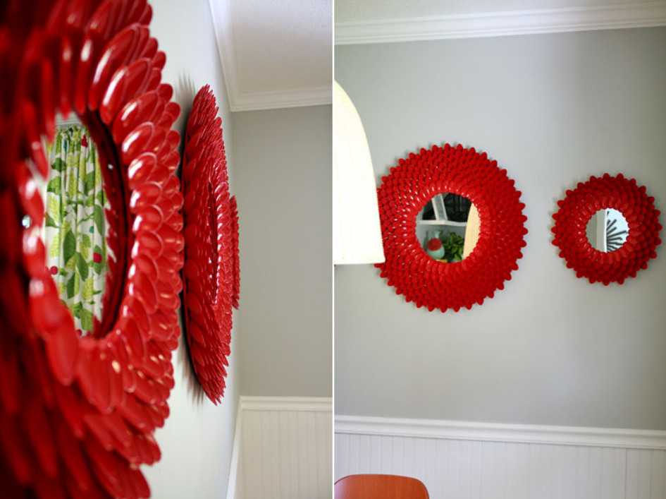 В современный интерьер отлично впишутся зеркала с декором из пластиковых ложек и прищепок. На фотографиях ниже видно, что сделать такие зеркала не так уж и сложно.