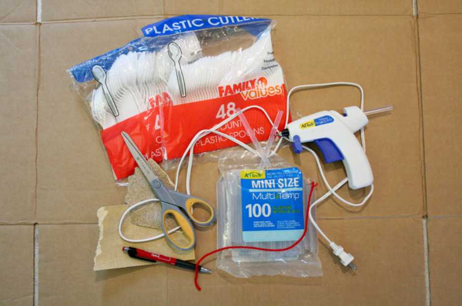 Выкладываем на картон столовые приборы таким образом, чтобы они располагались равномерно. Не забываем чередовать предметы разного размера.