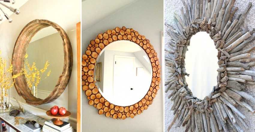 Зеркала четерехугольной формы можно обрамлять грубо обработанными деревянными брусками, а круглые зеркала окружать радиально отходящими «лучами» из дерева. Для этого понадобится деревянная рама-основа, бруски дерева для декора, термоклей.