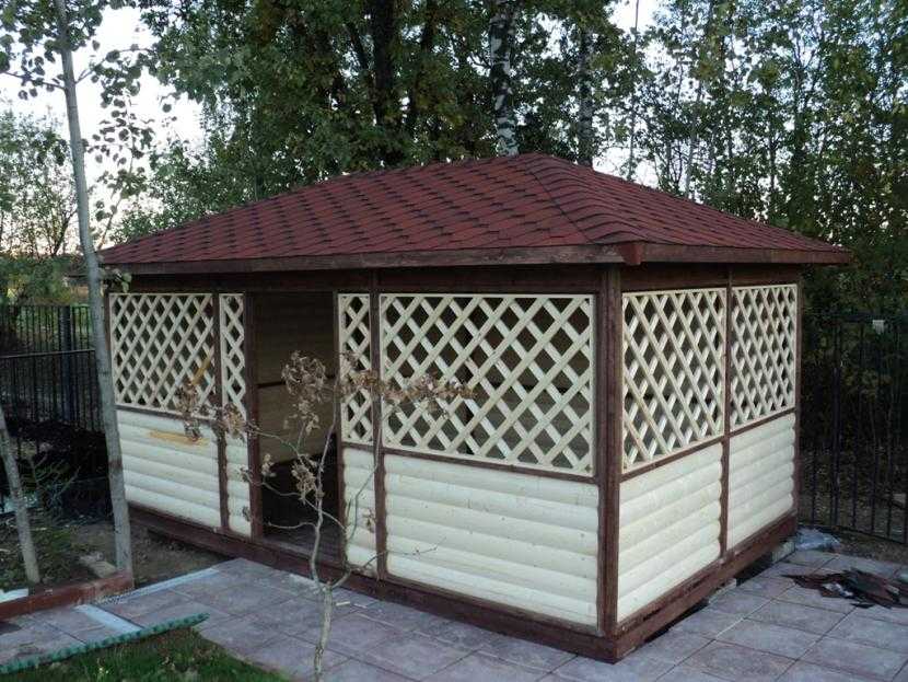 Прежде чем обшивать беседку, необходимо произвести вычисления длины материала. Самым сложным здесь являются расчёты — необходимо четко вымерить размеры, чтобы расстояния в ячейках было одинаковым и вся «картинка» смотрелась симметрично.