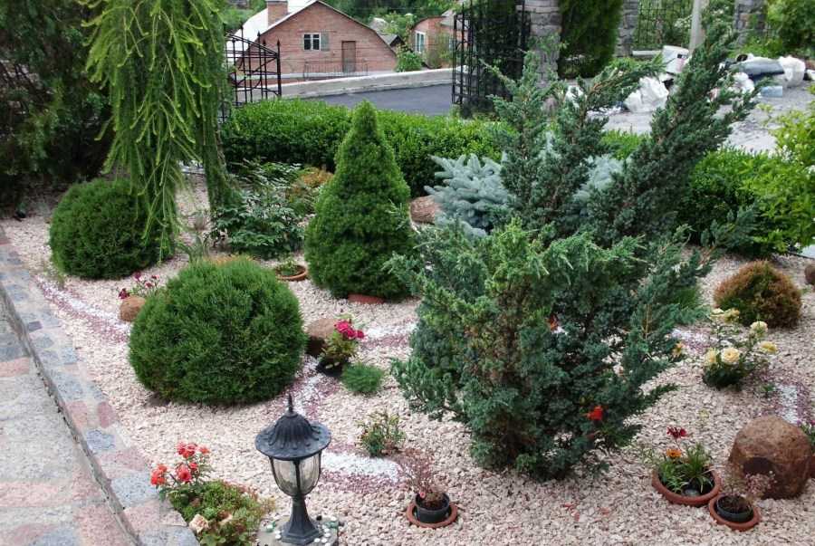 Рокарий со светлой мелкой галькой и небольшими хвойными растениями