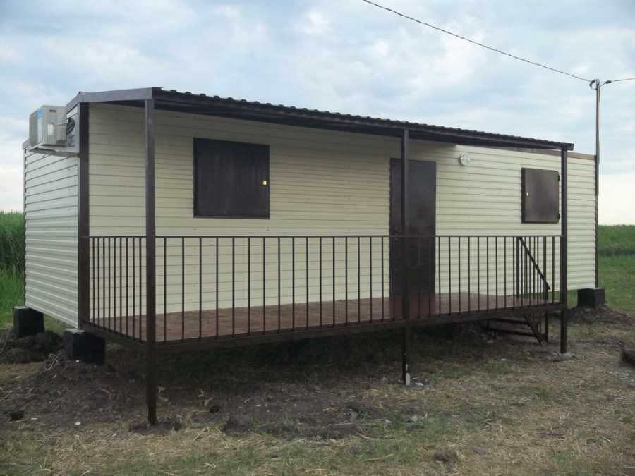 Для установки такого контейнерного хозблока не требуется заливка фундамента, будет вполне достаточно столбчатого фундамента или простых бетонных блоков. В уже готовом виде (правда, может понадобиться минимальная сборка внутренних коммуникаций, например, подключение шлангов к водосборникам, что вполне можно сделать самостоятельно) его доставляют на участок, для монтажа потребуется автокран. Внешне такой сарай выглядит не очень привлекательным, но благодаря его надежности, долговечности и мобильности такой хозблок можно будет продать после окончания строительства жилого дома.