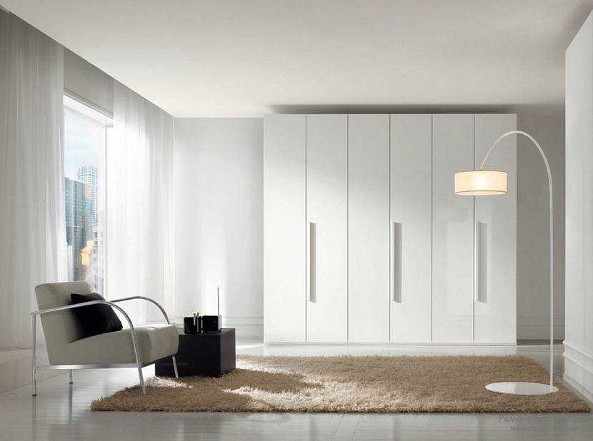 Один из вариантов планировки – угловое расположение гардеробного отсека. Такое размещение идеально для малогабаритного жилья. Устроить угловую гардеробную возможно в спальне, площадь которой около 20 м?. Такие габариты комнаты позволяют отвести под вспомогательную зону хранения вещей площадь примерно 3-4 м?, что вполне достаточно для организации вместительной гардеробной конструкции. Остается лишь правильно подобрать двери, гармонично вписывающиеся в существующий стиль комнаты. Для образца можно использовать фото шкафов-гардеробных в спальню.