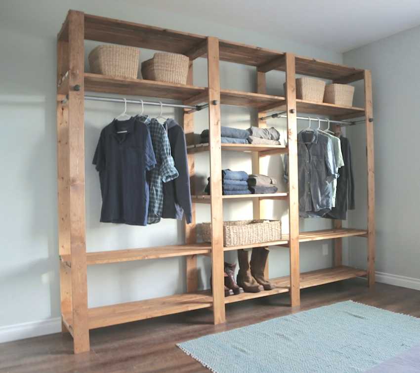 - чаще всего используются в маленьких комнатах вместительные полки, не скрываемые за дверьми, поэтому вся одежда находится в пределах видимости, что снижает затраты времени на поиск нужной вещи;