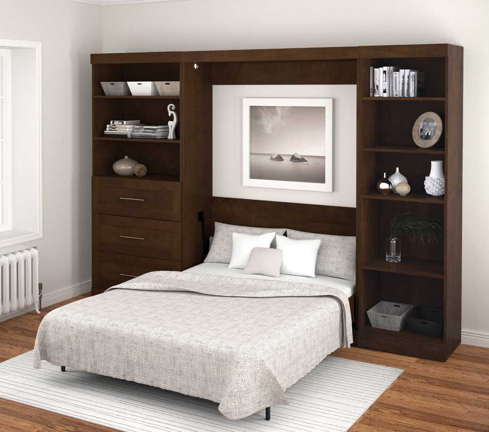 Другой вариант – объединить спальную зону со встроенными шкафами. Конструкция имеет два отделения, в одном прячется вертикальная кровать, а во втором размещается вместительная система хранения с выдвижными ящиками и вешалками для одежды или стеллажом для книг. В собранном виде кровать-шкаф даже не очевидно заметна и не вызывает подозрений. А сам шкаф не отличается от своих аналогов, поэтому знать о главной особенности мебели будут только посвященные. Особенно если нижняя часть кровати имеет фальш-ручки для ящиков и полностью имитирует поверхность шкафа.