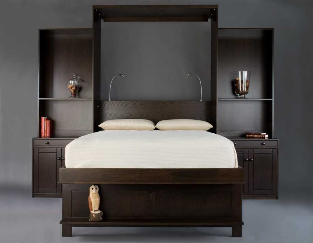 Откидная от стены кровать отлично спрячется в шкаф и сэкономит примерно 4 квадратных метра. При этом нижняя часть кровати маскируется под шкаф с ручками и ящиками, что позволяет полностью сымитировать и повторить дизайн всего гарнитура. И складная кровать ничем не отличается от стационарных кроватей. В другом варианте кровать в вертикальном положении закрывается раздвижными дверями, по типу шкафа-купе.