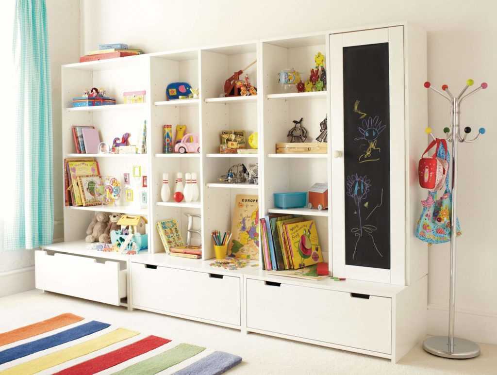 Стеллажи. О них было немного упомянуто чуть раньше. Открытые полки позволят ребёнку самостоятельно расставить всех своих игрушечных друзей по своему вкусу и усмотрению. Он сможет доставать их и ставить на место тогда, когда захочет, не прибегая к помощи родителей. В выдвижных ящиках стеллажа удобно хранить одежду и постельное бельё. Стеллаж может быть небольшим (на 3-4 секции) или во всю стену;