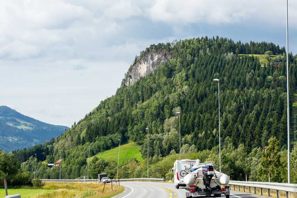Типичная очень хорошая норвежская дорога. Видны главные враги полноприводной мощной легковушки с шестиступенчатой коробкой: лодковозы и дома на колёсах.