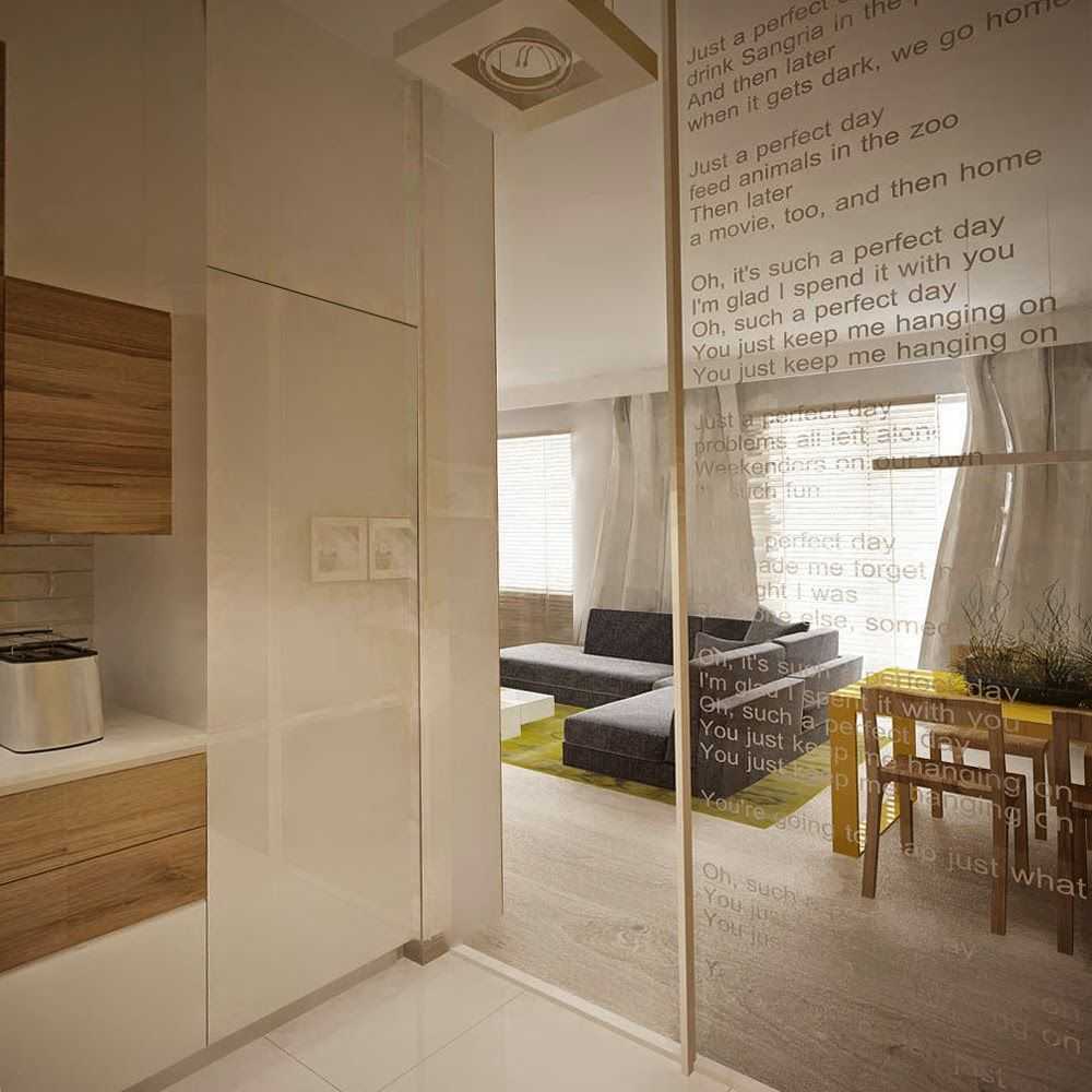 Небольшая современная квартира со стационарной стеклянной перегородкой из прозрачного стекла
