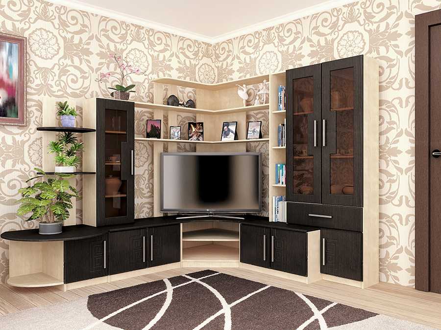 Такие типы позволяют расставить модули в разных последовательностях. Чаще по краям устанавливаются шкафы, в углу рассчитывается зона под телевизор, посередине монтируются невысокие тумбы. В качестве альтернативной планировки по краям ставятся полки с низкими тумбами под ними, по центру – угловой шкаф.