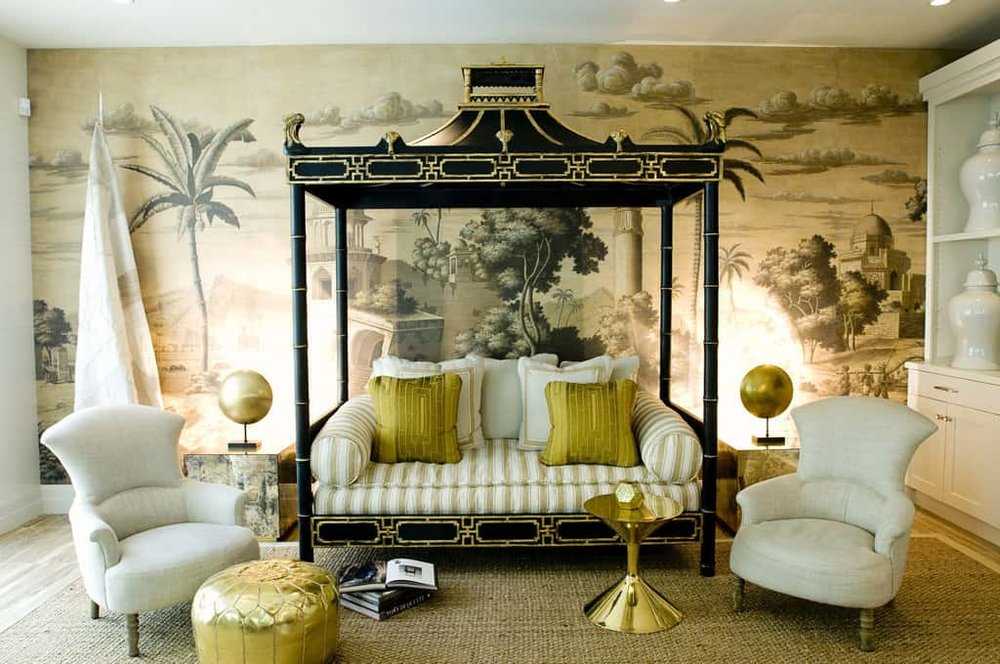 Если ты вдохновишься и решишь сделать все по канонам, в роли обоев должны будут выступить расписные шелковые полотна. Но подойдут и простые обои с принтом, или даже самостоятельная роспись стен, это не сложно, если перерисовывать растения и птиц с детализированных изображений, и вдвойне приятнее. Не обязательно переделывать все стены в доме, достаточно всего одной, она станет изысканным акцентом.