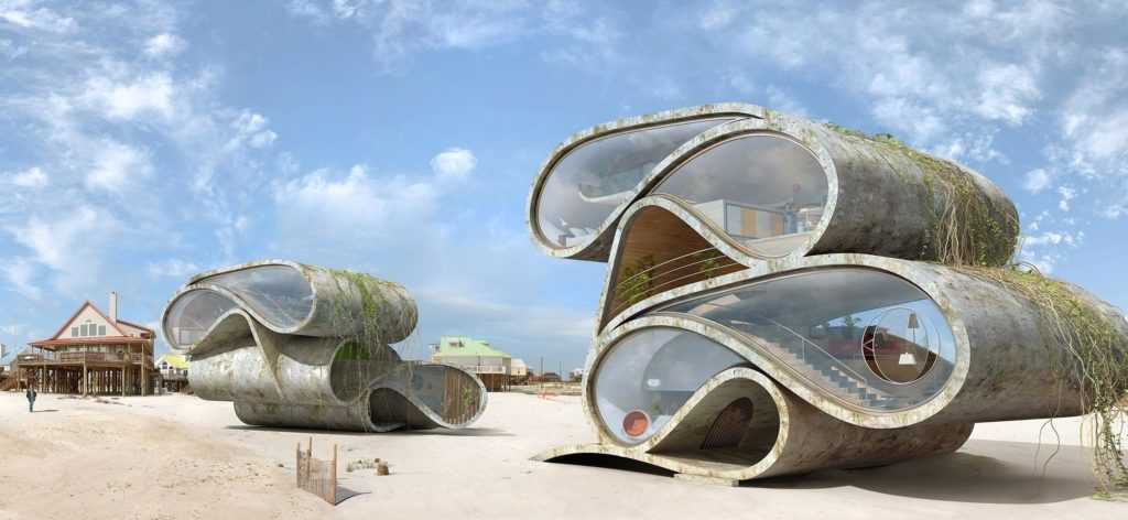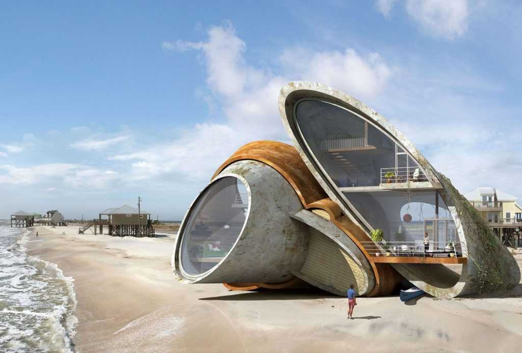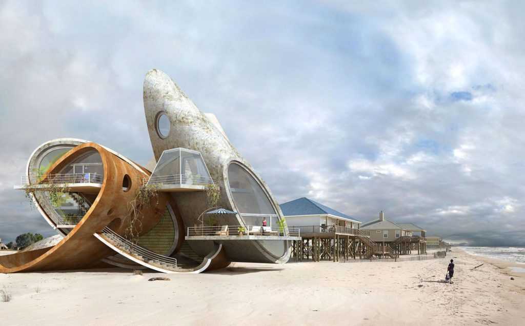 С помощью компьютерной программы он смоделировал невероятные дома, имеющие обтекаемую форму корпуса, созданного из стали и бетона с шероховатой поверхностью, которые смогут устоять перед мощным давлением ветра и напором воды.