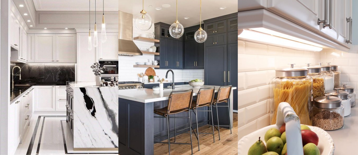 Классическая схема планировки освещения кухни представлена тремя видами современных светильников: