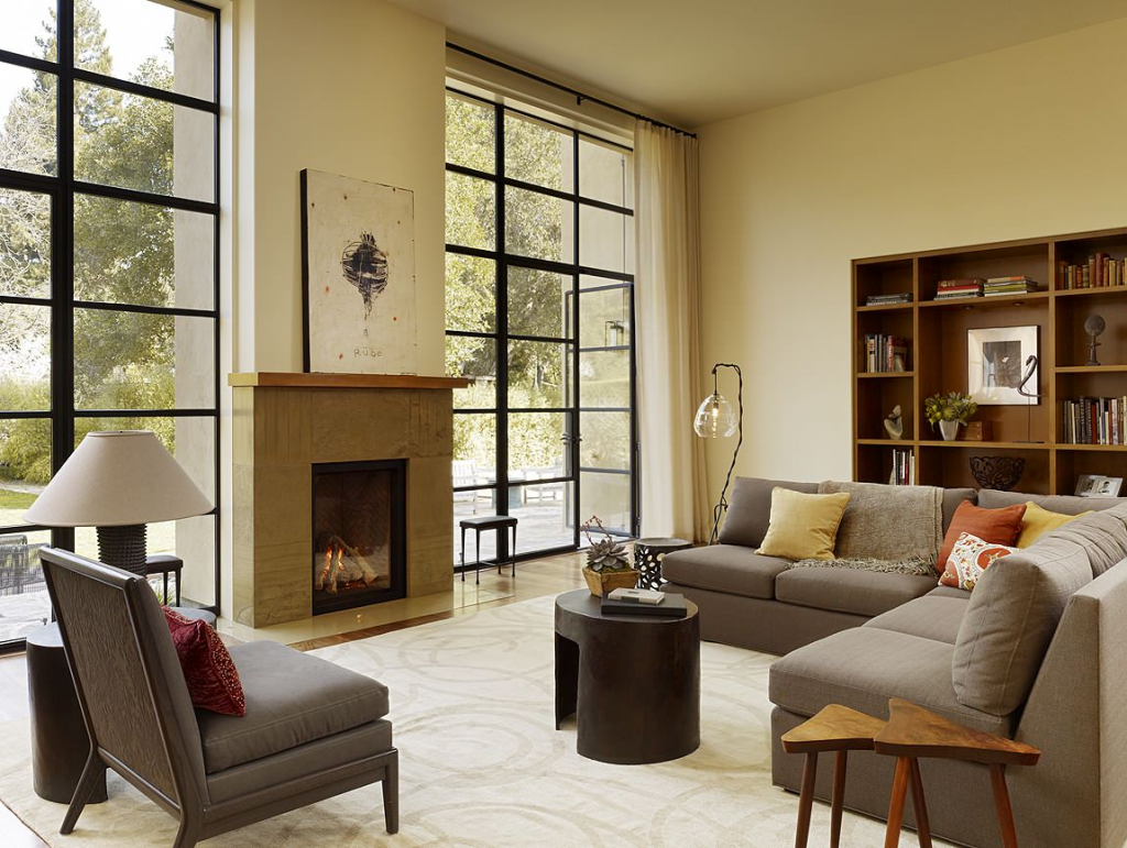 Домашняя уютная гостиная в бежевых тонах с камином, диваном округлой формы, журнальным столиком в виде облачка