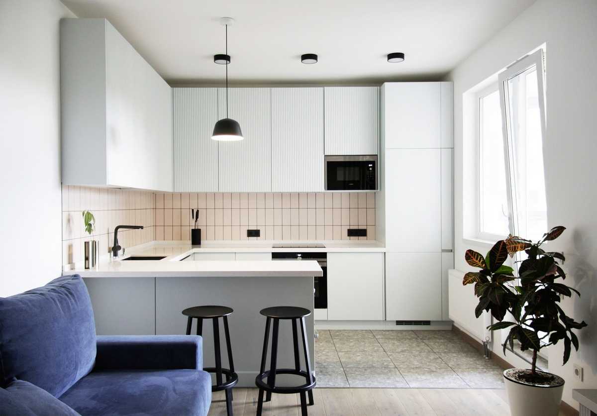 Фасады следует выбирать близко к расцветке стен либо белые. Таким образом шкафы «растворятся», и помещение не будет выглядеть тесным. Дизайнеры советуют, чтобы П-образная планировка была светлой. Подойдут бежевый, кремовый, серый и белый оттенки.