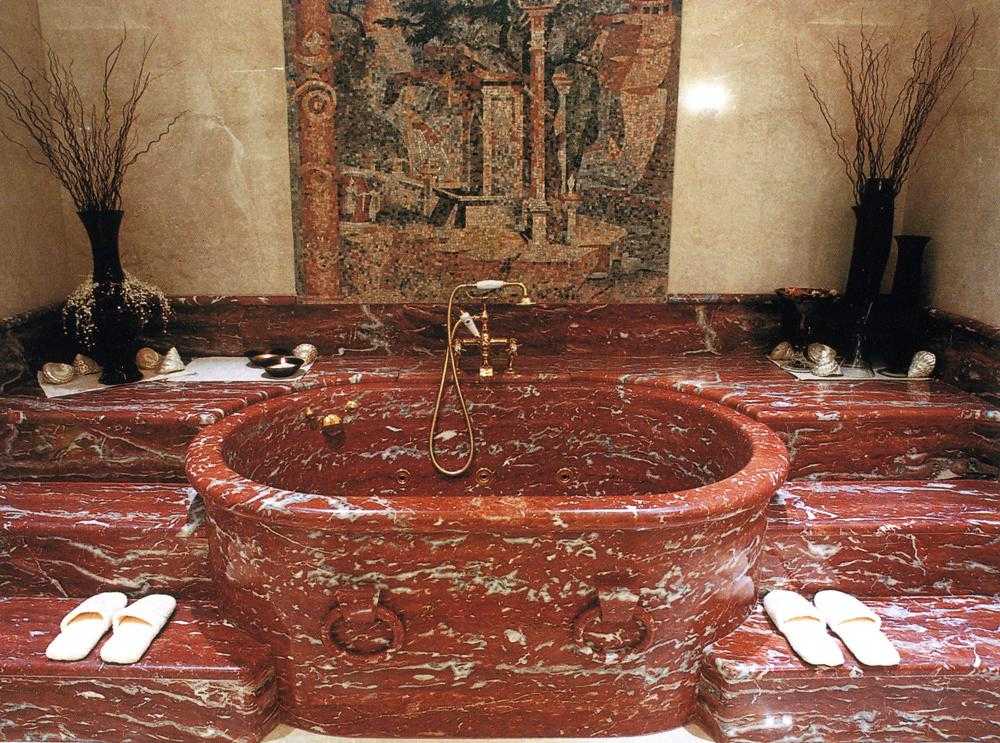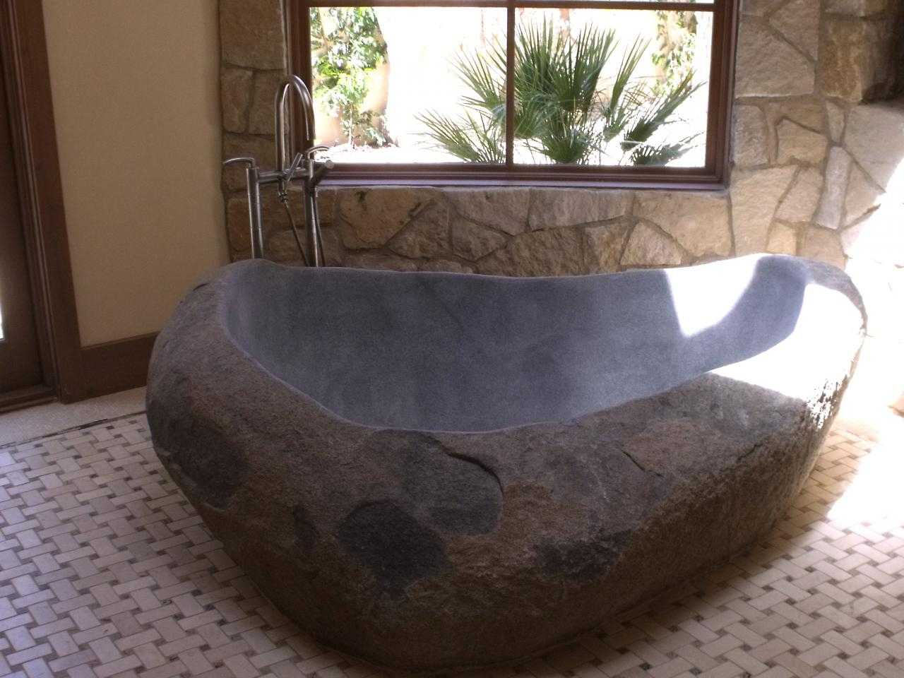 Другой вариант эксклюзивных ванн – изготовленные из натурального или искусственного камня: мрамора, гранита, песчаника, оникса, травертина. Изделия имеют индивидуальные размеры и тяжелый вес, каждая ванна уникальная. При правильной эксплуатации срок службы до 50 лет.