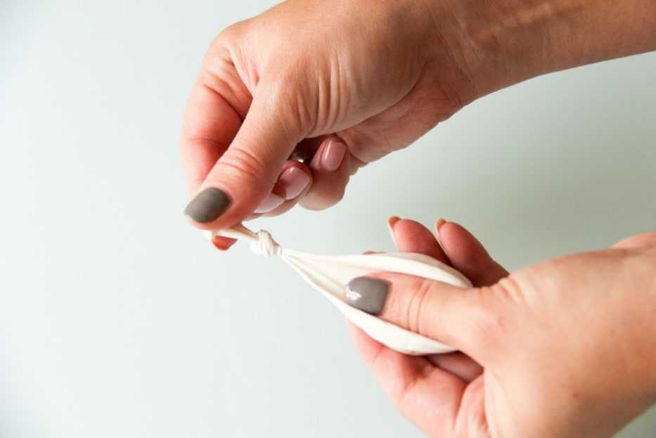 - Отрежьте 20-25 см шнура, вставьте в большой шар посредине между ушами и завяжите концы.