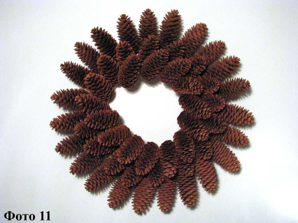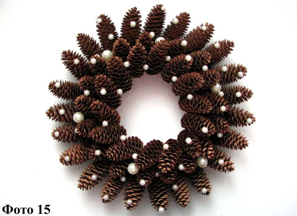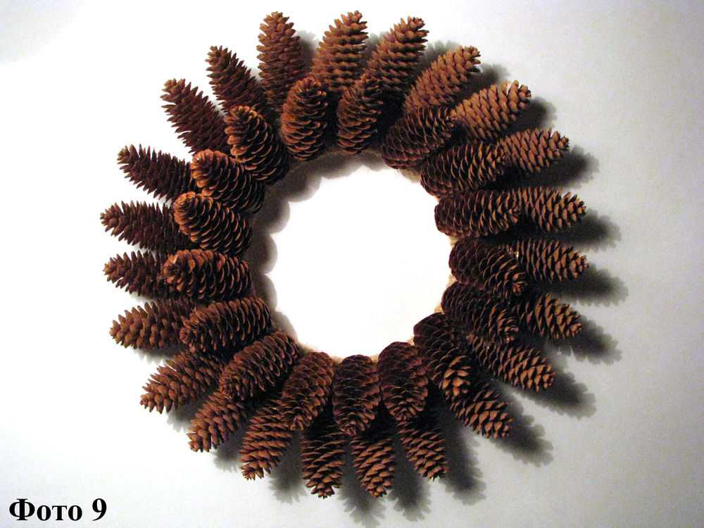Следующий вариант оформления венка больше соответствует модным тенденциям. Все потому, что для него используется натуральный материал, а именно шишки.